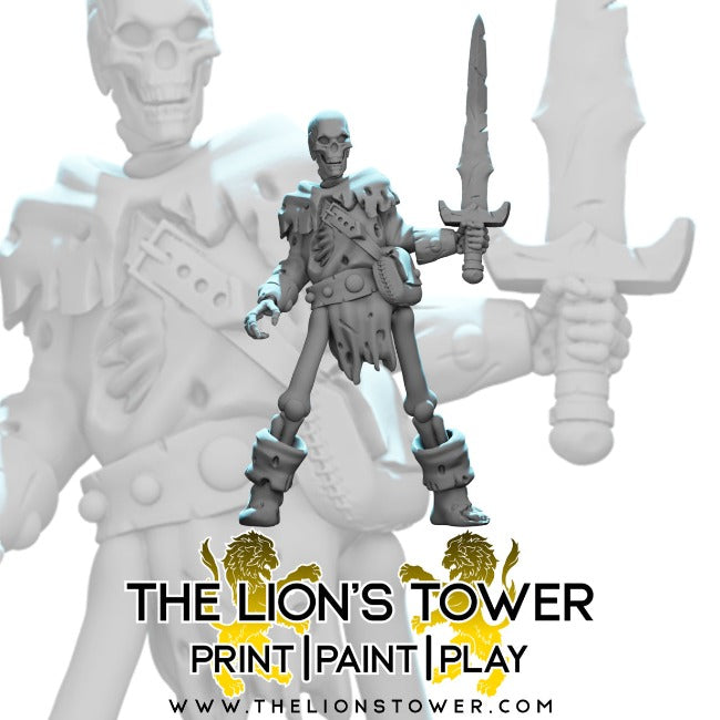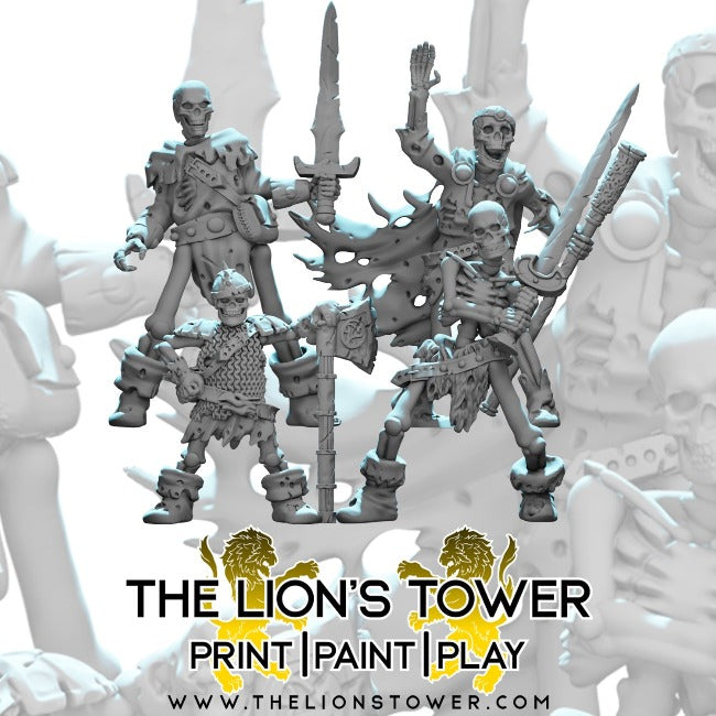 The 4 Classic Skeleton versions of the iconic Hero miniatures: Dwarf, Barbarian , Wizard and Elf.  All bearing details and poses of their former selves, though tattered and worn over the ages!
