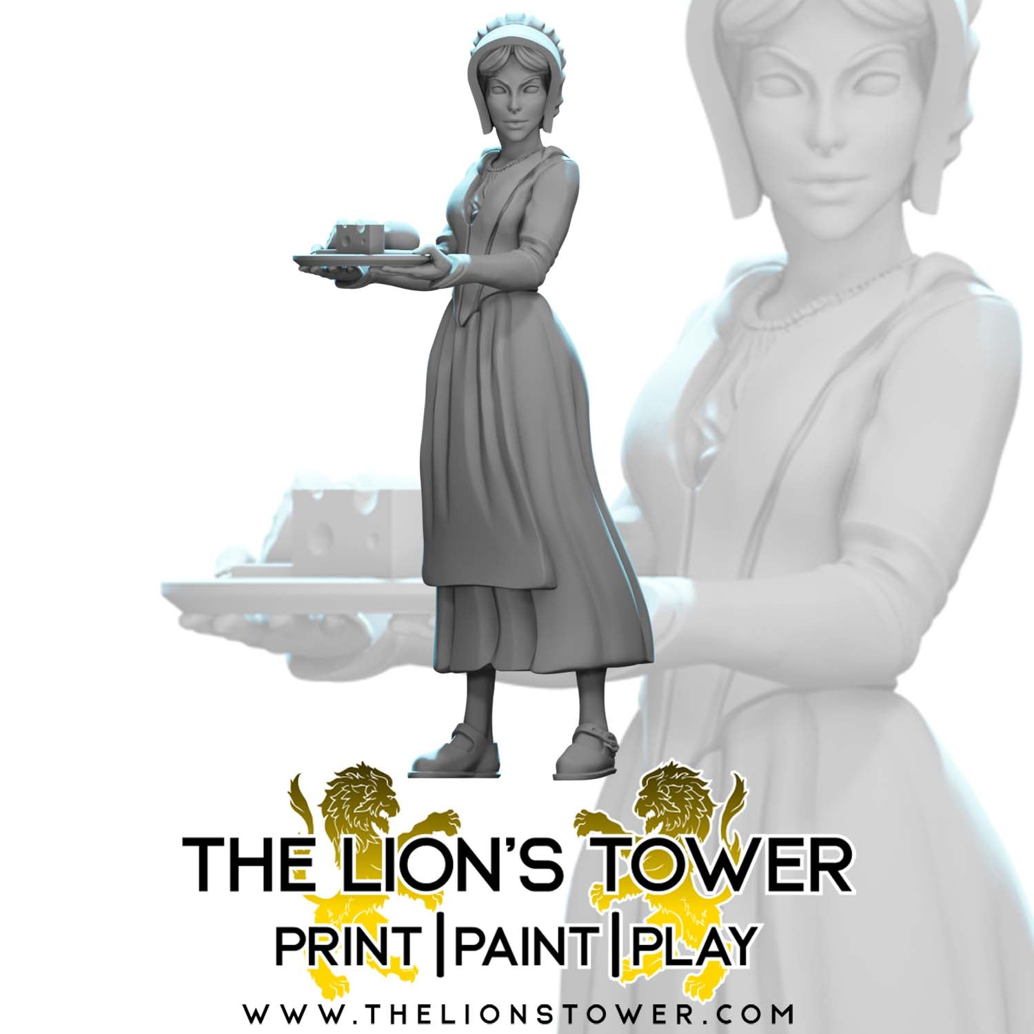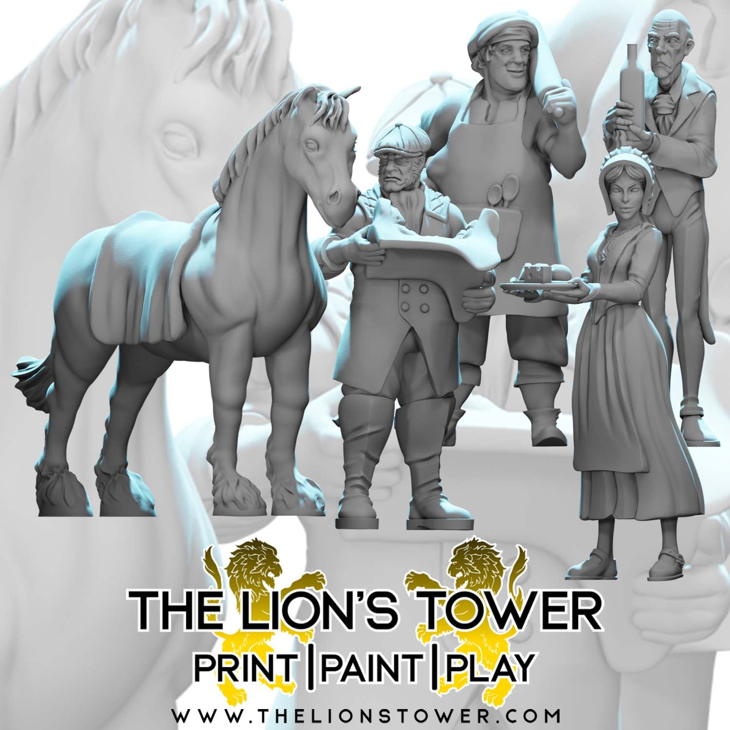 The Von Thumper household is a very respected noble family with a live in serving staff of 5. This set contains the 5 servants - Gabriel VanDalen the cook, Amber Wier the maid, Thenwick White the butler and Savi Perk the Stablemaster/Groundskeeper with his horse Ed.